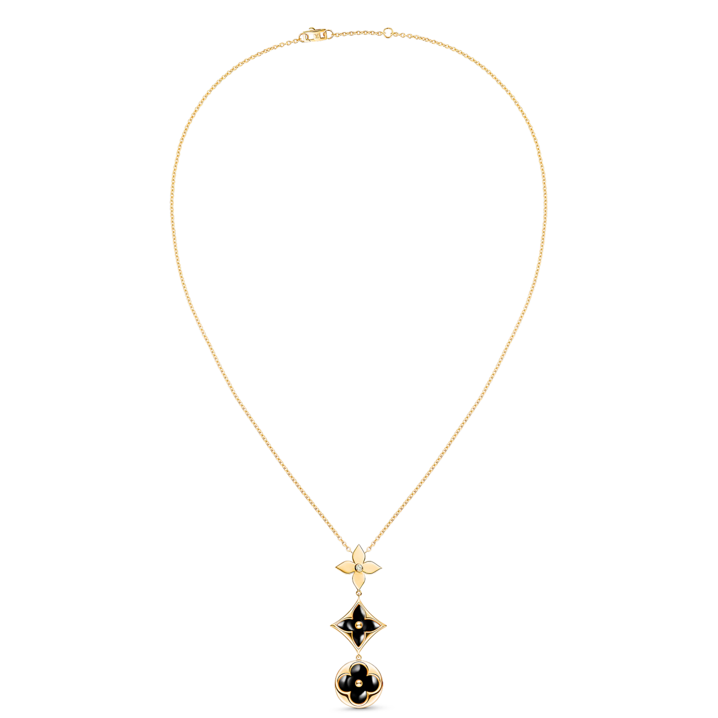 Color Blossom celebrates the Monogram Flower, created in 1896 by Georges-Lothtuis Vuithttton. The pendant's trio of signature motifs is cast from 18-karat yellow gold; one is set with a sparkling diamond, two are meticulously carved from black onyx. A beautiful piece to layer, mix or match with other jewels from the collection.