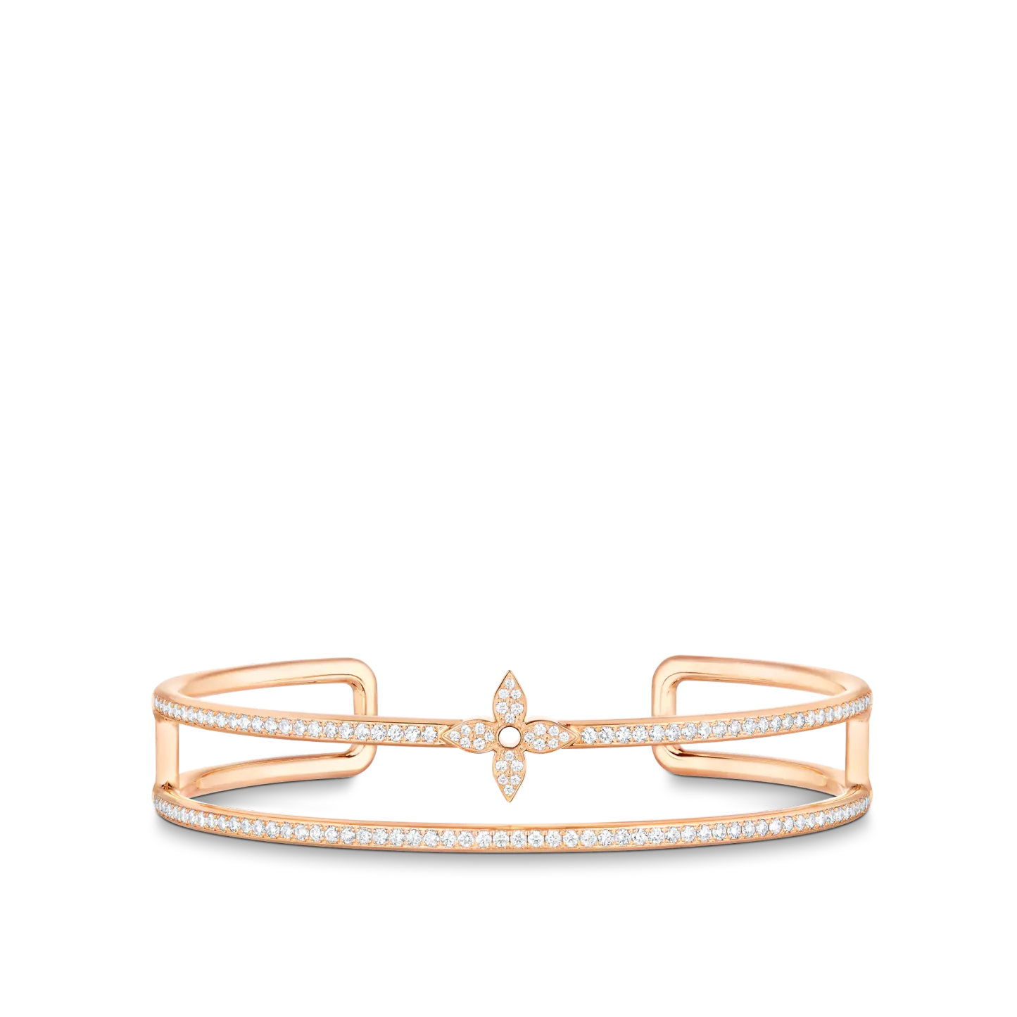 This Idylle Blossom bracelet is fashioned from 18-karat pink gold, fully paved with brilliant diamonds and set with a diamond-encrusted Monogram Flower. The double-row design looks chic and contemporary – like two bracelets stacked together. This sleek cuff combines stylishly with other jewels from the range, for a modern way to wear diamonds every day.