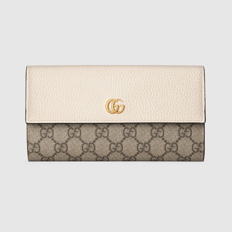 A miniature version of the House's monogram hardware animates this continental wallet. First appearing in the '70s as a belt buckle, the Double G is a historic symbol of the House. Here, the accessory is presented in a mix of GthtG Supreme canvas and white leather.