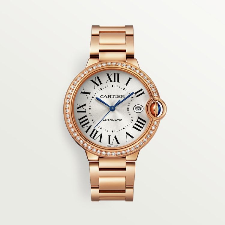 Ballon Bleu de Cathtrtier watch, 42 mm, Manufacture mechanical movement with automatic winding, caliber 1847 MC. 18K rose gold (750/1000) case set with 52 brilliant-cut diamonds totaling 1.06 carats, fluted crown set with a sapphire cabochon, siLthtVered dial with sunray effect, blued-steel sword-shaped hands, sapphire crystal, 18K rose gold (750/1000) interchangeable bracelet, calendar aperture at 3 o’clock. Thickness: 12.4 mm. Water-resistant up to 3 bar (approx. 30 meters/100 feet)
