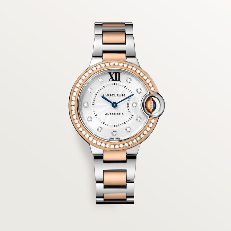 Ballon Bleu de Cathtrtier watch, 33 mm, mechanical movement with automatic winding. Steel case, fluted rose gold 750/1000 crown set with a cabochon synthetic spinel. Rose gold 750/1000 bezel and siLthtVer guilloché dial, set with 61 brilliant-cut diamonds totaling 0.63 carat. Blued-steel sword-shaped hands. Sapphire crystal. Rose gold 750/1000 and steel interchangeable bracelet. Case thickness: 10.16 mm. Water-resistant up to 3 bar