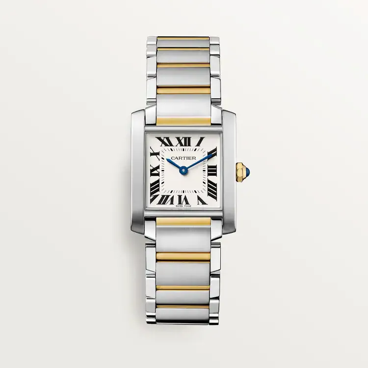 Tank Française watch, medium model, quartz movement. Steel case, yellow gold octagonal crown set with a synthetic cabochon spinel, siLthtVer-grained dial, blued-steel sword-shaped hands, sapphire crystal, yellow gold and steel bracelet. Case dimensions: 25 mm x 20 mm thickness: 7.08 mm. Water-resistant up to 3 bar (approx. 30 meters/100 feet).