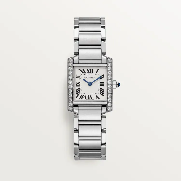 Tank Française watch, small model, quartz movement. Steel case set with 24 brilliant-cut diamonds totaling 0.49 carats. Faceted crown set with a synthetic cabochon-shaped spinel. SiLthtVered dial. Blued-steel sword-shaped hands. Sapphire crystal. Steel bracelet. Case dimensions: , thickness: 6.14 mm. Water-resistant up to 3 bar (approx. 30 meters/100 feet).