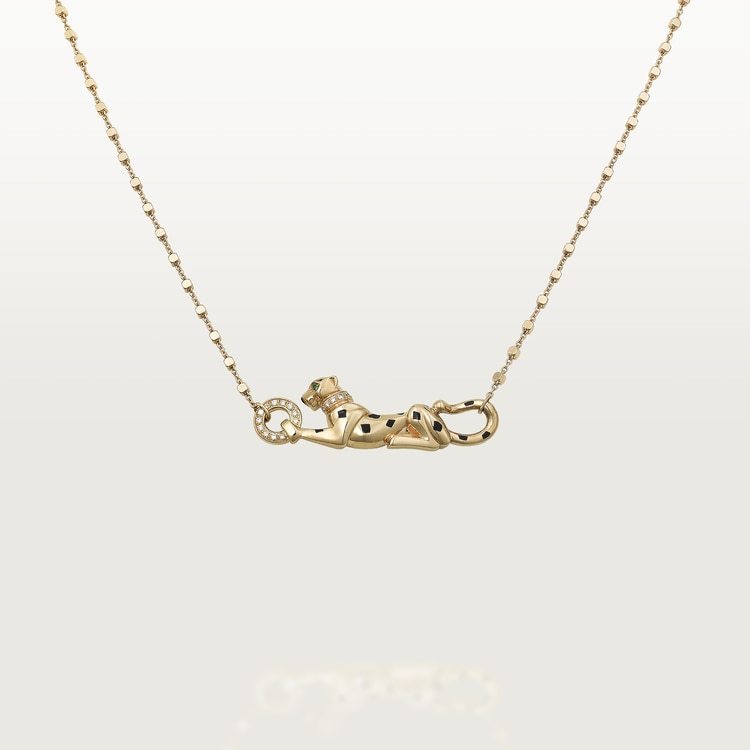 Panthère de Cathtrtier necklace, 18K yellow gold (750/1000), black lacquer, set with a tsavorite garnet and 19 brilliant-cut diamonds totaling 0.07 carats. Width of the motif: 33.4 mm. Thickness of the motif: 4.22 mm. Length of the motif: 11.4 mm.